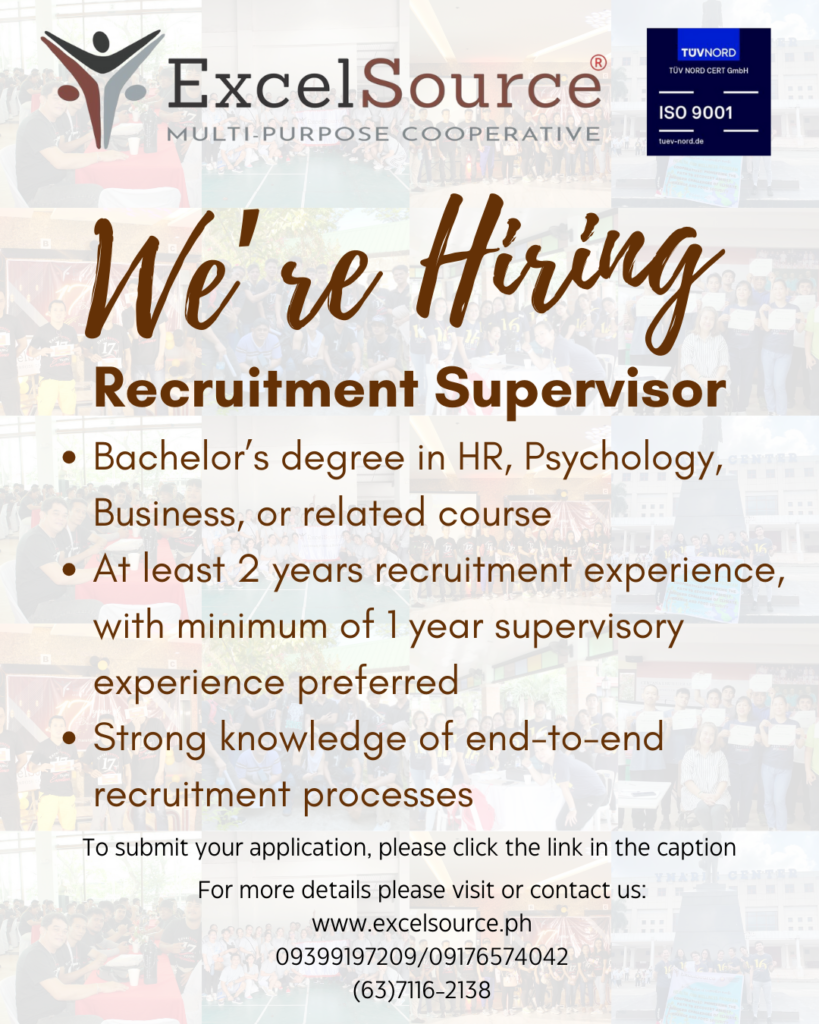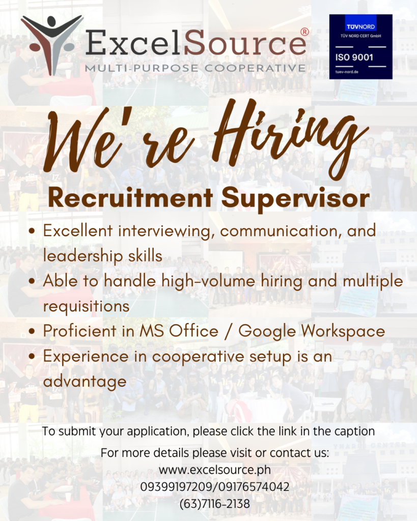 Recruitment Supervisor Leave a Comment / Jobs / By Erica To submit application, please click the google form below.https://forms.gle/qFG2dYXF7XrviHHv5Or email us at generalinfo.empc@gmail.com and text/call us at 09176574042/09399197209Apply now and be a member!